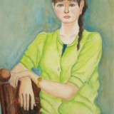 ビリジアンセーターの女性